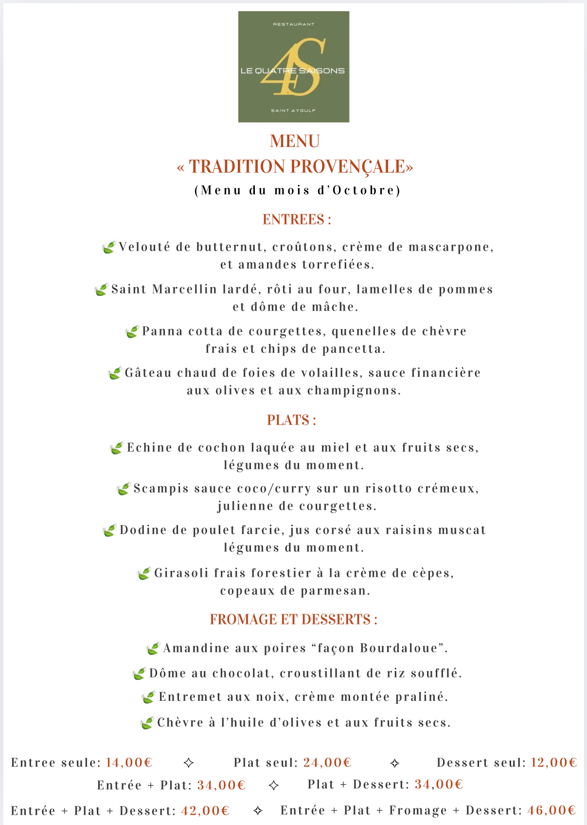 Nous vous proposons notre menu « Tradition Provençale » que vous pouvez décliner en plusieurs formules.