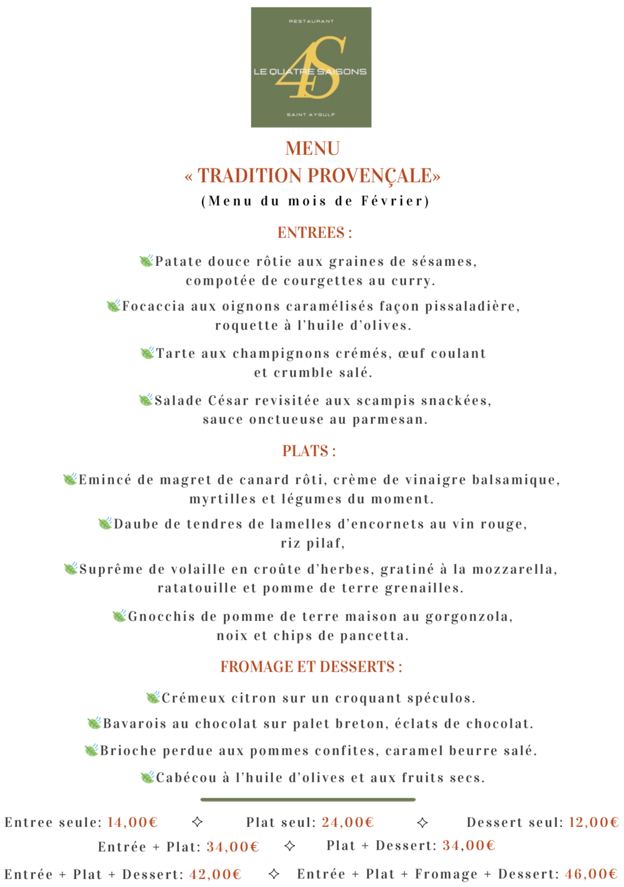 Nous vous proposons notre menu « Tradition Provençale » que vous pouvez décliner en plusieurs formules.